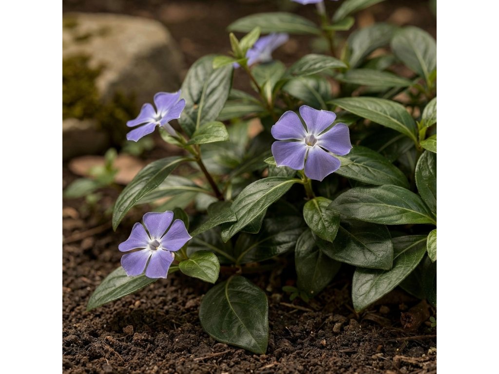 🌿 Apariencia: Tiene hojas brillantes de color verde oscuro y flores más grandes de color azul-púrpura (a veces blanco)