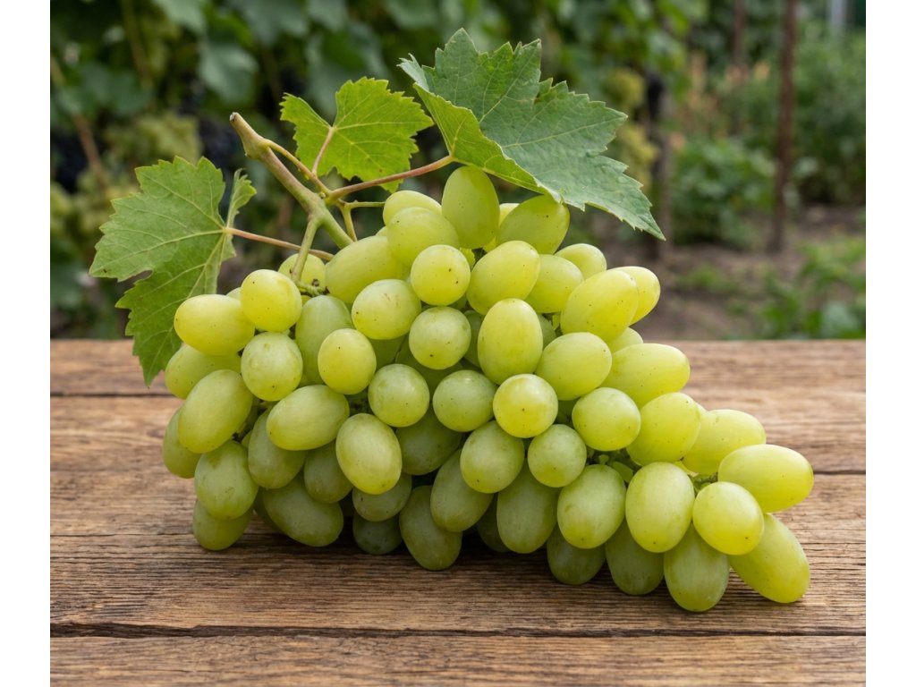 El período de maduración es muy corto, en agosto. Crecimiento muy exuberante. La flor es hermafrodita. Las cepas son cilíndricas, muy grandes, 600-1100 g Las uvas son ovaladas 27,5 x 21,5 mm, de color amarillo ámbar, muy grandes, con un peso medio de 10-12 g. La pulpa es carnosa, la cáscara es de densidad media. Resistente a enfermedades.