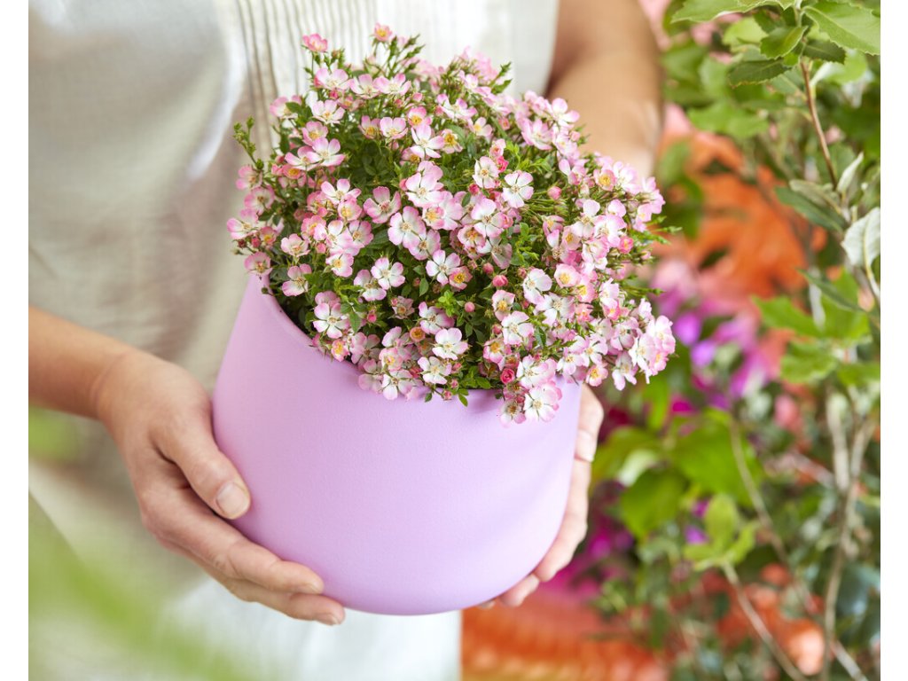 Solo crece 20 cm. Florece de un tono blanco - rosado.